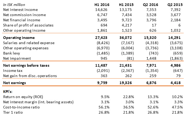 Arion Bank’s H1 2016 financial results