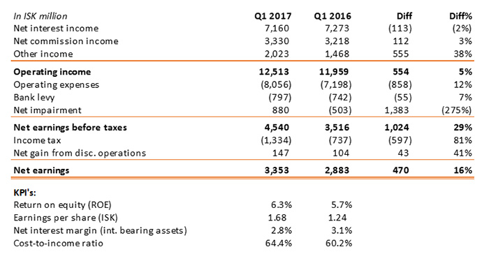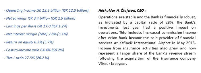 Arion Bank reported net earnings of ISK 3.4 billion for the first three months of 2017, compared with ISK 2.9 billion for the same period of 2016. Return on equity was 6.3%, compared with 5.7% for the first three months of 2016.