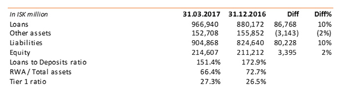 Total assets amounted to ISK 1,119.7 billion at the end of March, compared with ISK 1,036.0 billion at the end of 2016. Shareholders’ equity totaled ISK 214.6 billion at the end of March 2017, compared with ISK 211.2 billion at the end of 2016. The Bank enjoys a strong financial position and the focus has been on maintaining good liquidity as the capital controls are lifted, a process which is now largely at an end.