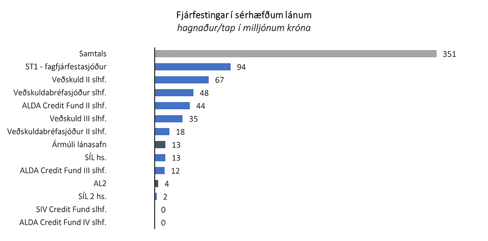 Frá árinu 2011 hefur eignaflokkurinn, innlendar sérhæfðar fjárfestingar í heild sinni, skilað um 1.858 milljón króna hagnaði af heildarfjárfestingu upp á um 3.845 milljónir króna. Í texta og myndum hér fyrir neðan má sjá árangur einstakra fjárfestinga sem eru nýhafnar (ljós bláar súlur), komnar langt á veg (bláar súlur) eða er lokið (dökk gráar súlur).
