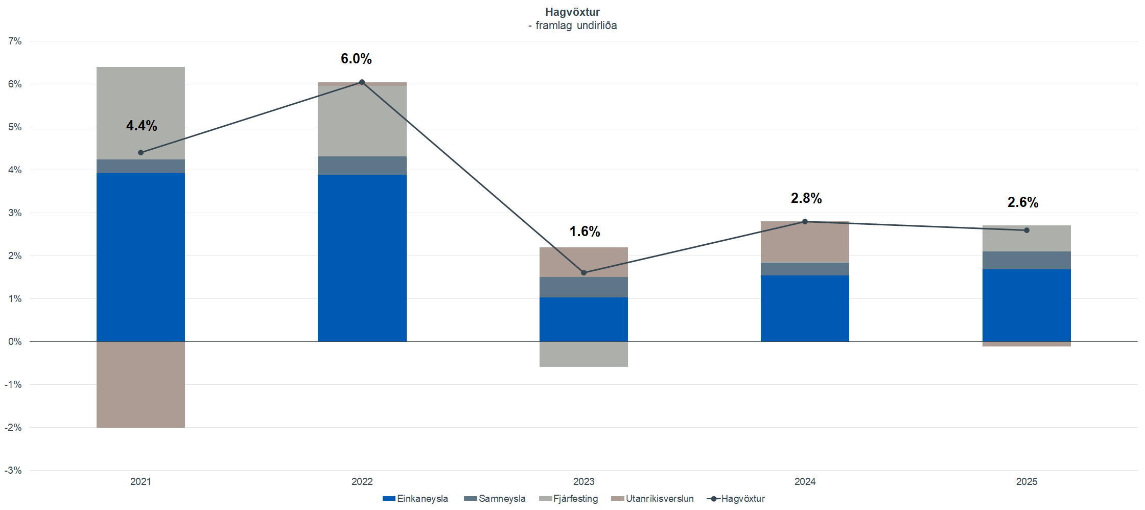 Útlit er fyrir að aðstæður á vinnumarkaði muni styðja við einkaneysluna, þó nokkuð hægi á vexti hennar á næsta ári eftir metár í ár. Gert er ráð fyrir að atvinnuleysi muni haldast nokkuð stöðugt út spátímann, á milli 3,7%-3,9%, og að fyrirtæki þurfi að mæta umtalsverðum launahækkunum á komandi misserum. Neikvæður raunlaunavöxtur er því aðeins tímabundinn. Spáð er nýjum veruleika á húsnæðismarkaði, veruleika þar sem vísitala íbúðaverðs sveiflast milli mánaða, árstakturinn fellur hratt og dansar í kringum núllið er líða tekur á næsta ár. Þá munu raunverðslækkanir vera viðvarandi næstu þrjú ár. Verðbólgan getur því hjaðnað nokkuð hratt, en sökum viðvarandi innlends verðbólguþrýstings og verðhækkana innfluttra afurða er verðbólgumarkmið Seðlabankans ekki í augsýn. Spáð er 6% verðbólgu á næsta ári. Óbreyttir vextir eru enn um sinn líklegasta niðurstaðan, en þróunin mun ráðast af kjölfestu verðbólguvæntinga, aðhaldi í ríkisfjármálum og ákvörðunum á vinnumarkaði.