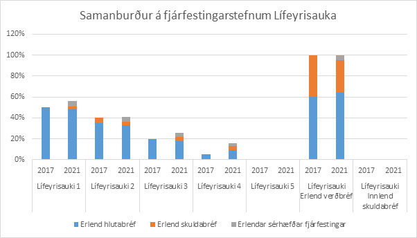 Eftir að fjármagnshöft voru afnumin árið 2017 hefur Lífeyrisauki lagt mikla áherslu á að auka vægi erlendra eigna og breidd í eignasafni og eru erlendar eignir mikilvægur þáttur í áhættudreifingu sjóðsins. Markmið um vægi erlendra eigna í fjárfestingarstefnu sjóðsins hefur hækkað á síðustu árum eins og sést á mynd 1. Þannig hefur markmið blandaðra deilda sjóðsins í erlendum eignum hækkað um allt að 11% frá 2017 til 2021 en sjóðfélögum er frjálst að velja á milli leiða eftir því hvaða fjárfestingarstefna hentar hverjum og einum.