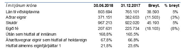 Eiginfjárhlutfall bankans var 21,9% í lok júní en var 24,0% í árslok 2017. Hlutfall almenns eiginfjárþáttar 1 nam 21,8%, samanborið við 23.6% í árslok 2017.