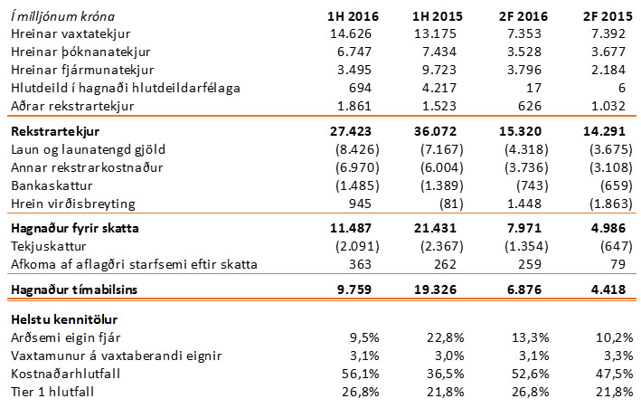 Eiginfjárhlutfall bankans í lok júní var 27,8% en var 24,2% í árslok 2015. Hlutfall eiginfjárþáttar A hækkaði og nam 26,8% samanborið við 23,4% í árslok 2015.