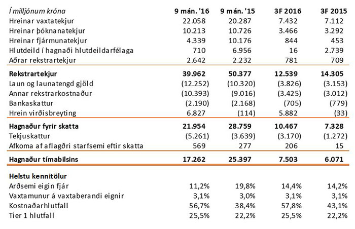 Eiginfjárhlutfall bankans í lok september var 26,1% en var 24,2% í árslok 2015. Hlutfall eiginfjárþáttar A hækkaði og nam 25,5% samanborið við 23,4% í árslok 2015.