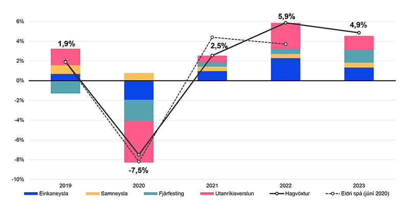 Ný hagspá Arion banka gerir ráð fyrir 7,5% samdrætti á árinu 2020. Efnahagshorfur fyrir veturinn hafa versnað á síðustu vikum og útlit fyrir að samdrátturinn nái inn á næsta ár. Efnahagsbatinn fer þar af leiðandi hægt af stað en reiknað er með kröftugum hagvexti árin 2022 og 2023, drifnum áfram af einkaneyslu og útflutningi. Hagspáin miðar við þá forsendu að áhrif COVID-19 á heimsbúskapinn taki að dvína fyrir alvöru á seinni hluta næsta árs. Ef það gerist fyrr eða seinna má í grófum dráttum segja að spáin hliðrist sem því nemur.