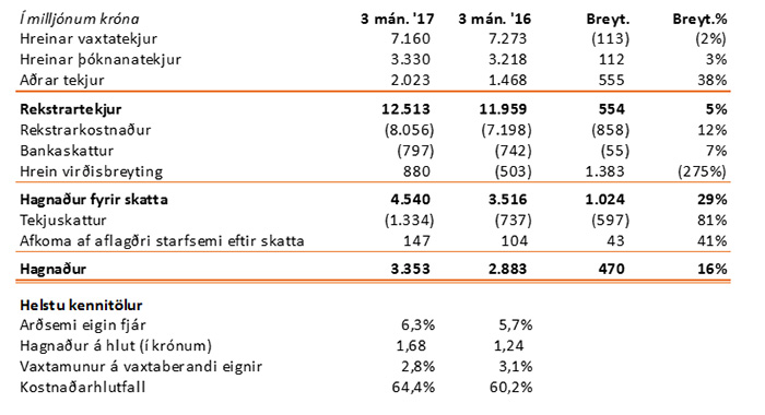 Hagnaður Arion banka á fyrstu þremur mánuðum ársins 2017 nam 3,4 milljörðum króna samanborið við 2,9 milljarða króna á sama tímabili 2016. Arðsemi eigin fjár var 6,3% samanborið við 5,7% fyrir sama tímabil árið 2016.