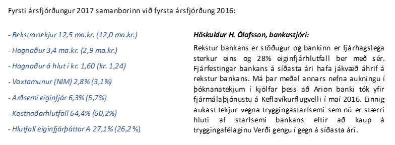 „Afkoma Arion banka á fyrsta ársfjórðungi er í takt við væntingar. Rekstur bankans er stöðugur og bankinn er fjárhagslega sterkur eins og 28% eiginfjárhlutfall ber með sér. Fjárfestingar bankans á síðasta ári hafa jákvæð áhrif á rekstur bankans. Má þar meðal annars nefna aukningu í þóknanatekjum í kjölfar þess að Arion banki tók yfir fjármálaþjónustu á Keflavíkurflugvelli í maí 2016. Einnig aukast tekjur vegna tryggingastarfsemi sem nú er stærri hluti af starfsemi bankans eftir að kaup á tryggingafélaginu Verði gengu í gegn á síðasta ári. Frekari áhrif þeirra kaupa eiga eftir að koma fram eftir því sem samstarf félaganna á sviði sölu trygginga eykst. Það er jafnframt ánægjulegt að launakostnaður bankans hækkar aðeins lítillega frá sama tímabili á síðasta ári þrátt fyrir aukin umsvif.