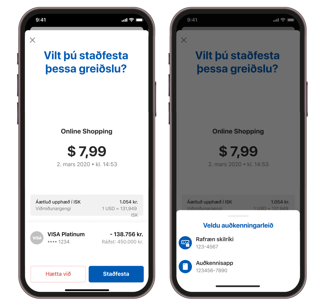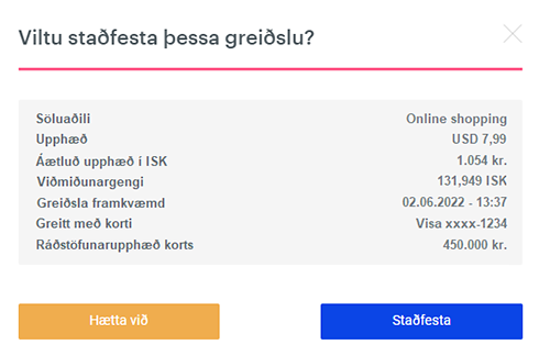 When you are shopping online and need to confirm a payment, you will receive notification from Arion Bank which will take you to the confirmation screen for that payment. This screen displays the details of the payment and you can confirm or decline the transaction.