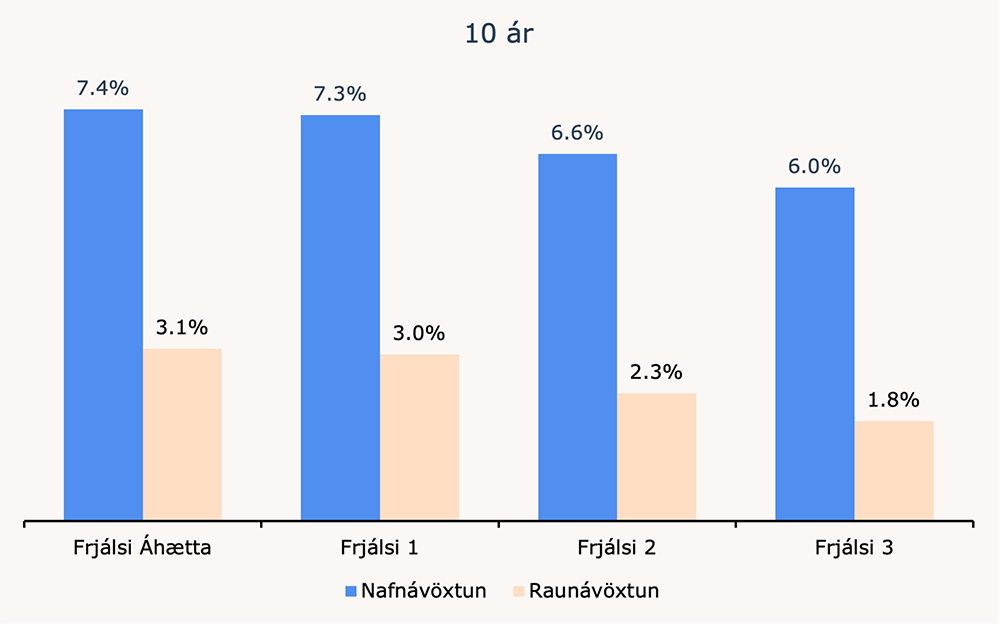 Hér fyrir neðan má sjá ávöxtun á ársgrundvelli til 5 ára og 10 ára m.v. 30.09.2025 . Þegar horft er á lengri tíma sparnað eins og lífeyrissparnað er mikilvægt að minna sig á að ávöxtun til lengri tíma er það sem mestu máli skiptir og ekki er óeðlilegt að það verði nokkrar sveiflur á milli ára. Þá eru sveiflur í áhættumeiri fjárfestingarleiðunum alla jafnan meiri á milli ára en á móti koma væntingar um hærri langtímaávöxtun.