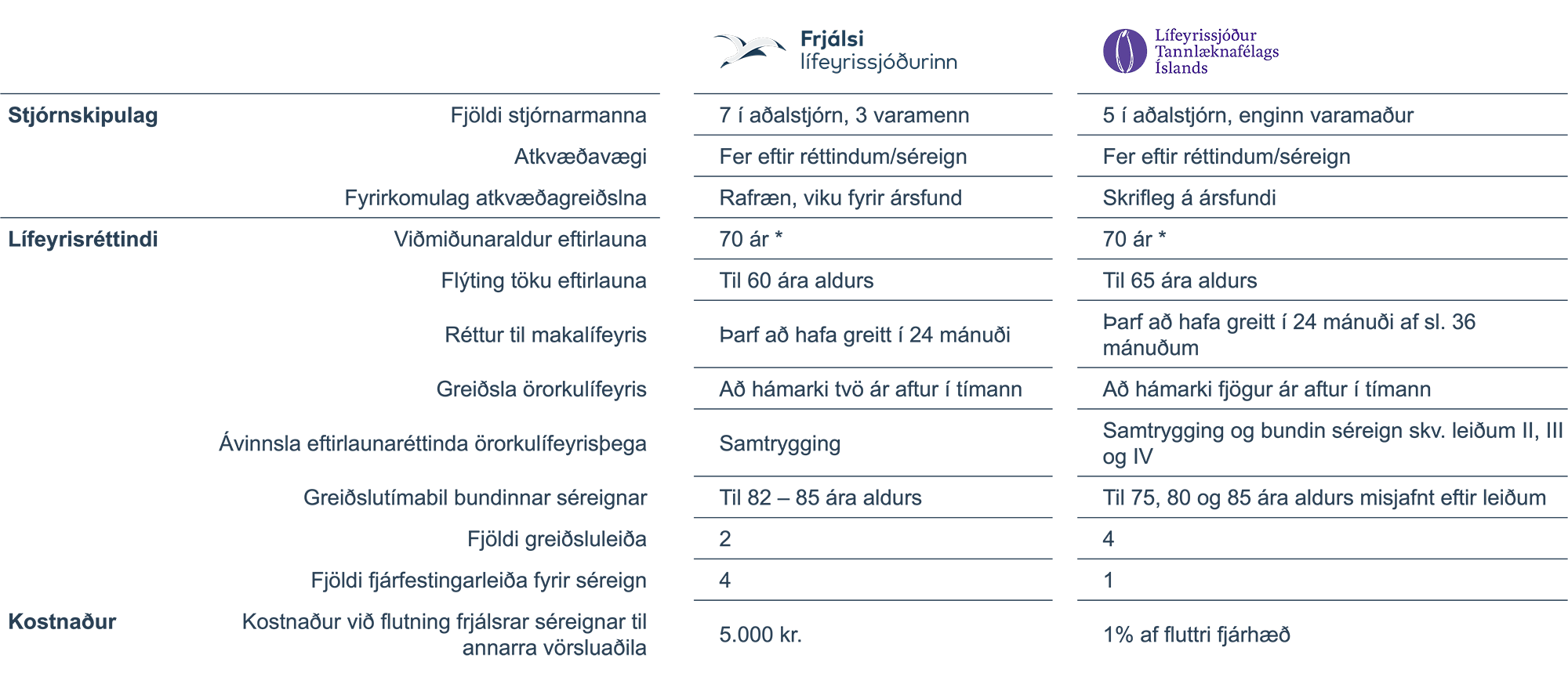 Leið I hjá LTFÍ er sambærileg Frjálsu leiðinni og Leið IV hjá LTFÍ sambærileg Erfanlegu leiðinni. Hjá Frjálsa fer þó hærra hlutfall 15,5% skylduiðgjalds í séreign gagnvart þessum sambærilegu greiðsluleiðum og jafnframt er hlutfallslega hærri réttindaávinnsla í samtryggingu.